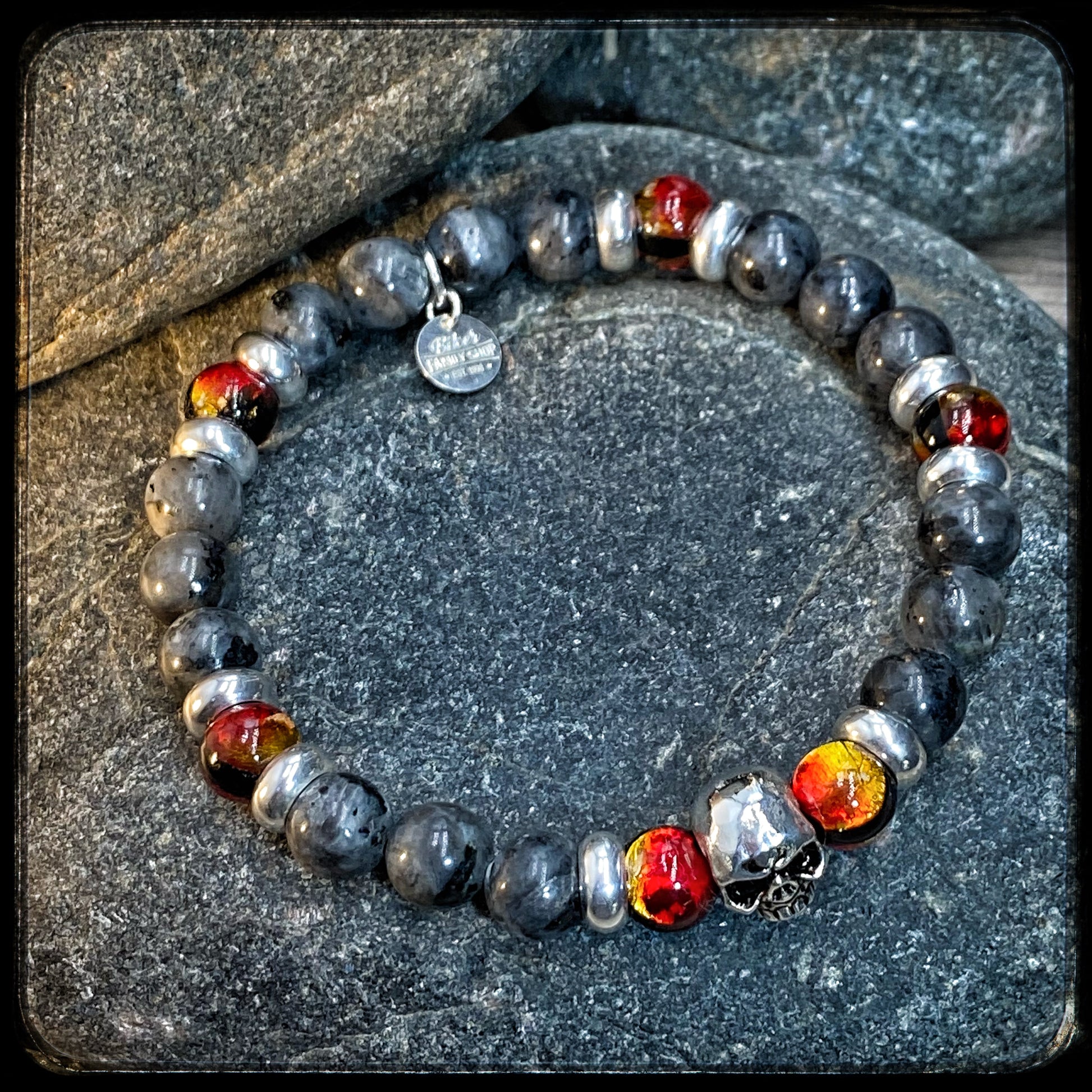 The blue larvikite beads reflect the light like cooled embers, and the 925 silver skull makes it clear that you're not here to knit.