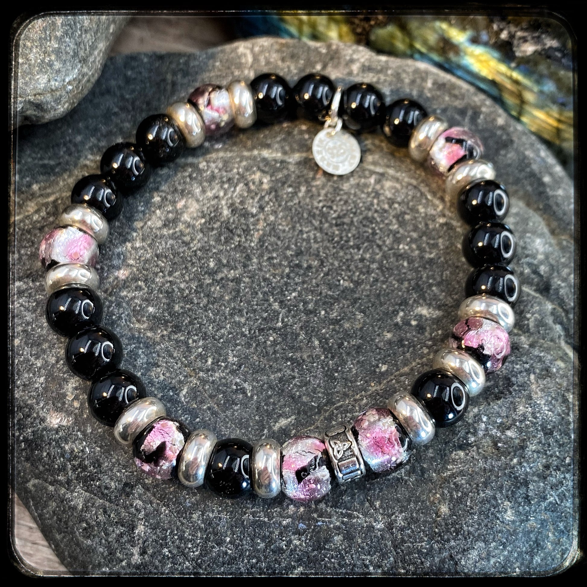 PINKY unisex bracelet – 8 mm Onyx beads & 925 silver Donut pattern