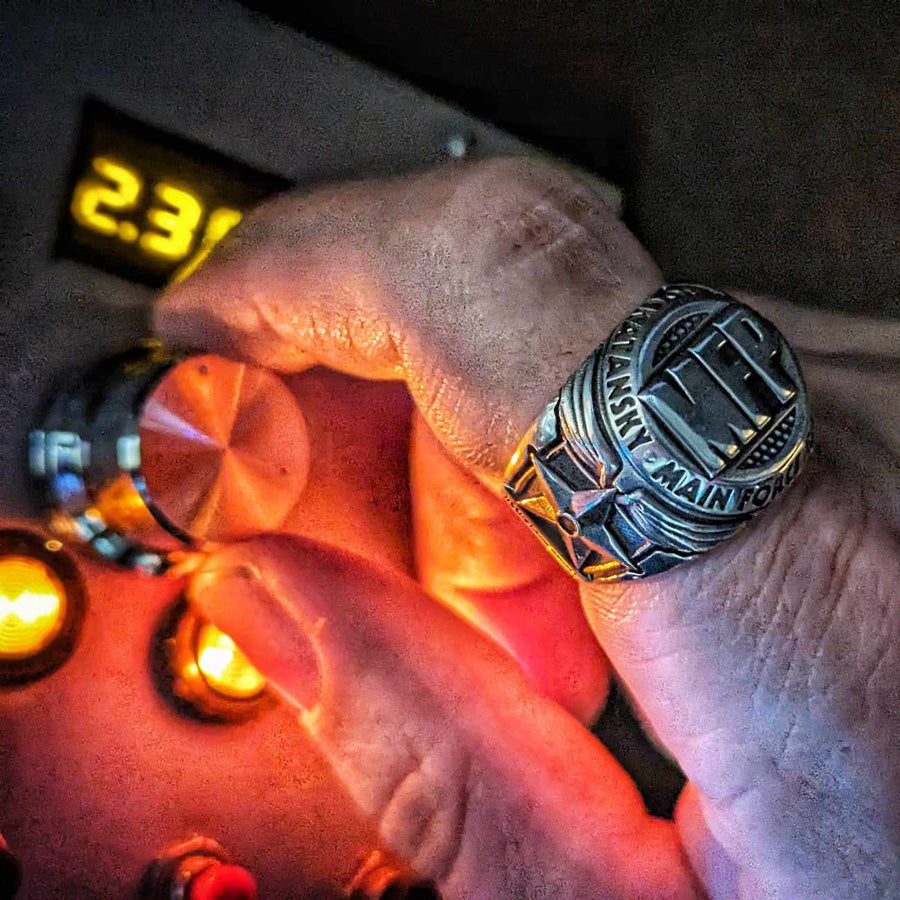 MAIN FORCE PATROL Ring - Tribute to the Cinematic Epic Dive into the heart of the crazy universe of MAX ROCKATANSKY with our MAIN FORCE PATROL Ring, a vibrant tribute to the cinematic epic that redefined the genre of action and dystopia.